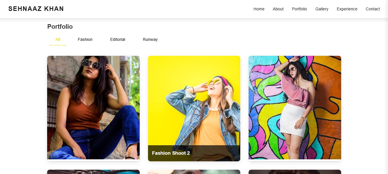 Categorized images from different photoshoots (e.g., casual, fashion, runway, commercial), making it easy for visitors to filter and explore specific looks or styles.